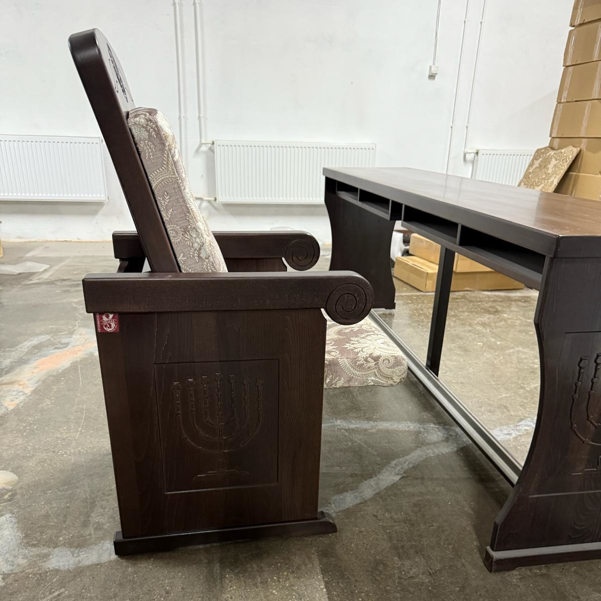 כסא "וילנה" מבית אוריג’ינל בני, עשוי עץ מלא עם ריפוד איכותי ונוח. מתאים לבתי כנסת, בתי מדרש וחדרי תפילה.